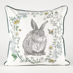 It features a cute easter bunny sat amid wildflowers, bees and butterflies. The reverse side of the cushion is spring green, while the sides are finished with a deep green piped trim.