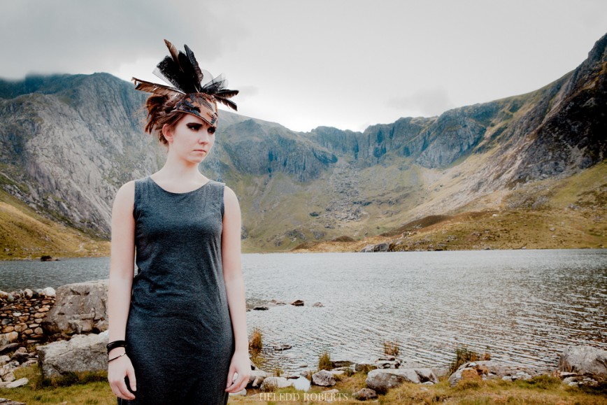 “Taken in the remote but magical Snowdonia, Wales, this project titled ‘Anghysbell’ (Welsh for ‘remote’) is a collaboration between myself, a fashion and portrait photographer, and Catrin Eluned Jones who is a textile pattern designer and creator of weird and wonderful headpieces. ‘Anghysbell’ is the personalisation of the Snowdonia Mountains, a place my heart calls home. From distant memories of roaming these mythical pyramids, the project conveys the striking beauty of the shapes and colours projected from them. A light, delicate but proud character presents the warmth and comfort of these spirited, embracing mountains. But the mountain is a lonely terrain, and the sense of overwhelming size and space takes over. This mountain where ancient mystery is still present in the rock. This character broods and lives deep in the history of the landscape; a troubled soul striving to grasp the light. To me, Snowdonia is the most stunning area I know, but I wanted to depict the endless rush of feelings I experience when in the company of the landscape – the wonder, the warmth, but the terror and loneliness too. Only through the fusion of fashion, figure and landscape can I express this, for words can never evoke those feelings for me.” Heledd Roberts 2013